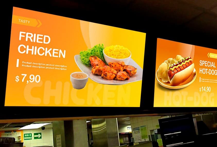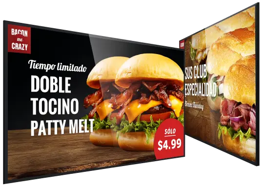 Son menús animados y estáticos que se muestran en pantallas de TV. Son ideales para presentar sus promociones y para facilitarle al cliente una elección rápida de su orden.